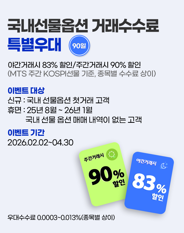 야간거래시 83% 할인/주간거래시 90% 할인(MTS 주간 KOSPI선물 기준, 종목별 수수료 상이)