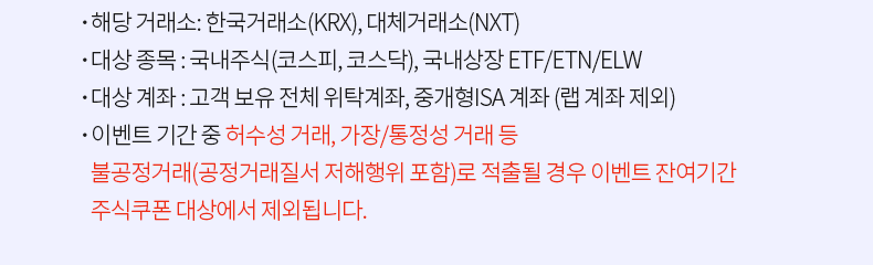 - 이벤트 기간 중 허수성 거래, 가장/통정성 거래 등 불공정거래(공정거래질서 저해행위 포함)로 적출될 경우 이벤트 잔여기간 주식쿠폰 대상에서 제외됩니다.