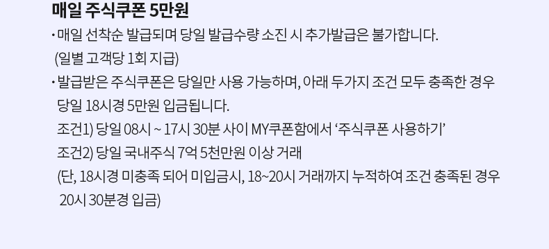 - 발급받은 주식쿠폰은 당일만 사용 가능하며, 아래 두가지 조건 모두 충족한 경우 당일 18시경 5만원 입금됩니다.