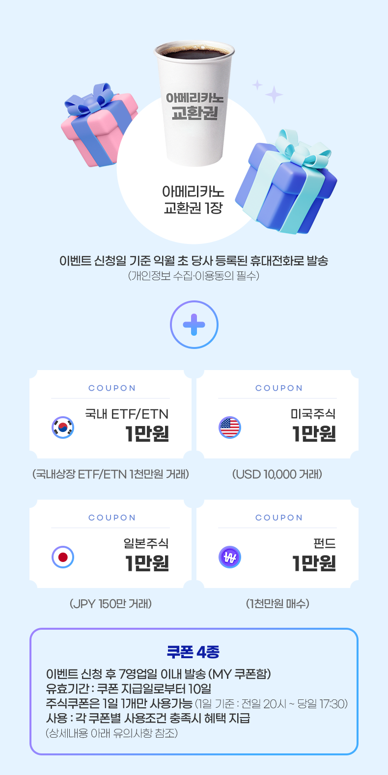 선착순 1만명. 아메리카노 교환권, 투자지원금 쿠폰 4만원