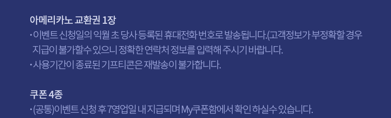 - 아메리카노 교환권 1장 - 이벤트 신청일 기준 익월 초 당사 등록된 휴대전화로 발송(개인정보 수집 · 이용 동의 필수)
