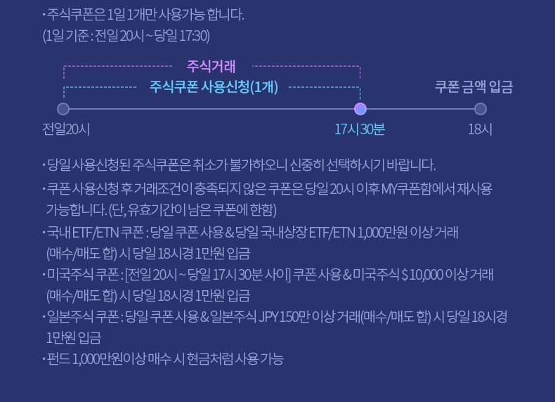 - 주식쿠폰은 1일 1개만 사용가능 합니다. (1일 기준 : 전일 20시 ~ 당일 17:30)