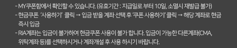 - - RIA계좌는 입금이 불가하여 현금쿠폰 사용이 불가 합니다. 입금이 가능한 다른계좌(CMA, 위탁계좌 등)를 선택하시거나 계좌개설 후 사용 하시기 바랍니다.