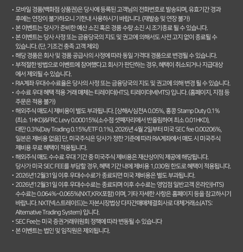 - 해외주식 매도 수수료 우대 기간 중 미국주식 제비용은 재산상이익 제공에 해당됩니다. 당사가 미국 SEC FEE를 부담할 경우, 혜택 기간 내에 제비용 1,030원 한도로 혜택이 적용됩니다.