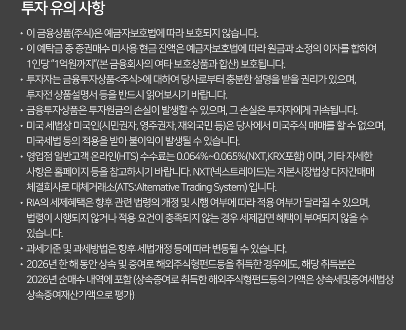 - 해외주식 매도시 제비용이 별도 부과됩니다. [상해A/심천A 0.05%, 홍콩 Stamp Duty 0.1%(최소 1HKD)&FRC Levy 0.00015%(소수점 셋째자리에서 반올림하여 최소 0.01HKD), 대만 0.3%(Day Trading 0.15%/ETF 0.1%), 2026년 4월 2일부터 미국 SEC fee 0.00206%, 일본은 제비용 없음] 단, 미국주식은 당사가 정한 기준에 따라 RIA계좌에서 매도 시 미국주식 제비용 무료 혜택이 적용됩니다.
